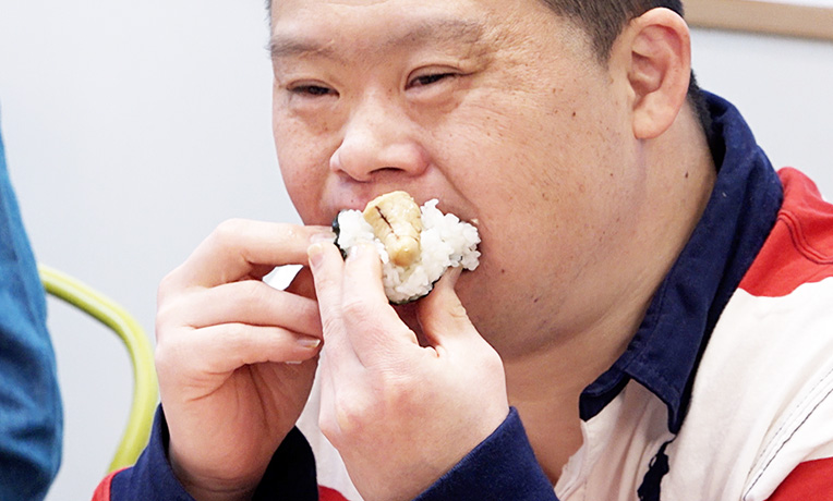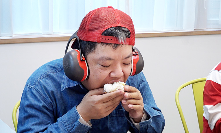 自分のすきな具ざいを持って、パンジーキッチンに集まったなかまたち。これから花見に行こうと、みんなで作るのは、にぎらないおにぎり。