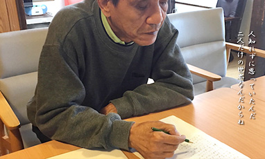田上康夫さん64才。いつのころからか詩を書き始める。ペンネームは「田上カサ」雨から守るカサのように、みんなを守りたいという想いがこめられているという。