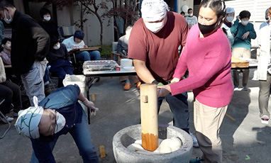 もちつきは、1人の力だけではできません。そこから生まれるなかまとのつながり。そして、いっしょにすることで生まれるまんぞく感。みんなの力を合わせてついたおもち、とくべつな味です。