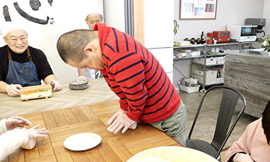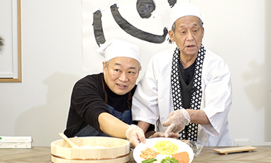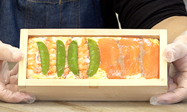見た目も美しい「おしずし」。大将の生田進さんが、お客さんたちにもかんたんに作れるようにある道具を用意しました。お客さんたちも、おしずしづくりにちょうせんです。