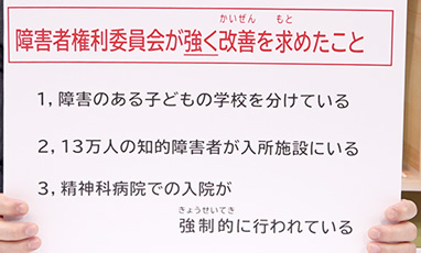 昨年、日本は国連・障害者権利条約のしんさを受けました。そのけっか、日本では障害者権利条約が目指す知的障害者の権利が今も実げんしていない。その実行を強くもとめました。国は、どうたいおうしていくのでしょうか。
