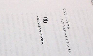 1年ぶりのパンジー・ディレクターズクラブのドラマ作品。タイトルは「N」。その意味は・・・。テーマ、ストーリーはどのように決まっていくのか。きゃくほん作り、立ちげいこ。クランクインまでの4か月を追った。