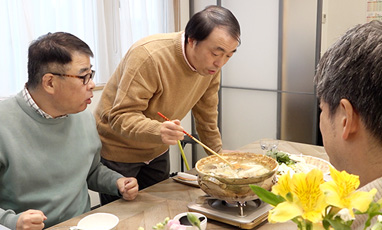 寒い冬はやっぱりなべ。広島の海からとどいたしんせんなカキを使って作った、土手なべをみんなでかこみます。身も心も温まります。