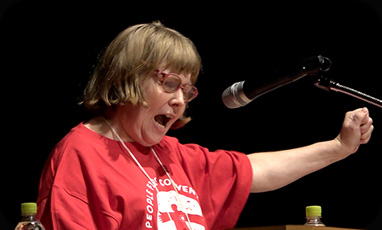 「1974年カナダで始まったピープルファーストの活動。目的は、入所施設のへいさです」(コリー)
