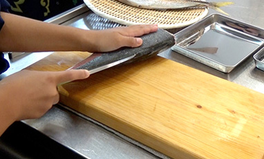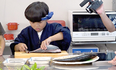 見事なほうちょうさばきの板前。実は、8才の男の子。あじを3枚におろすすがたのかっこよさ。お客さんたちの心に火をつけました。「私もやってみたい」。