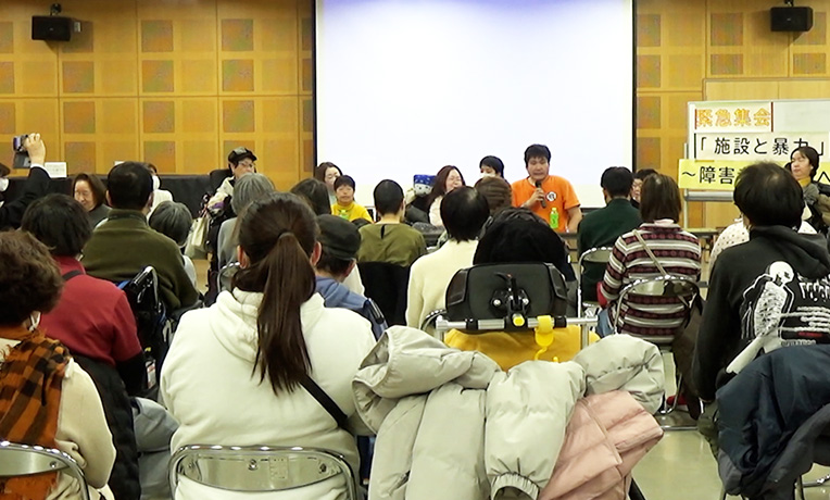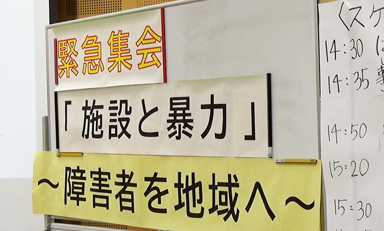 ふえつづける知的障害者への虐待。入所施設やグループホームなどの福祉施設でも多く起きています。兵庫県三田市の入所施設で起きた虐待事件に抗議する集会。なかまの知的障害者の心のさけびがつづきました。